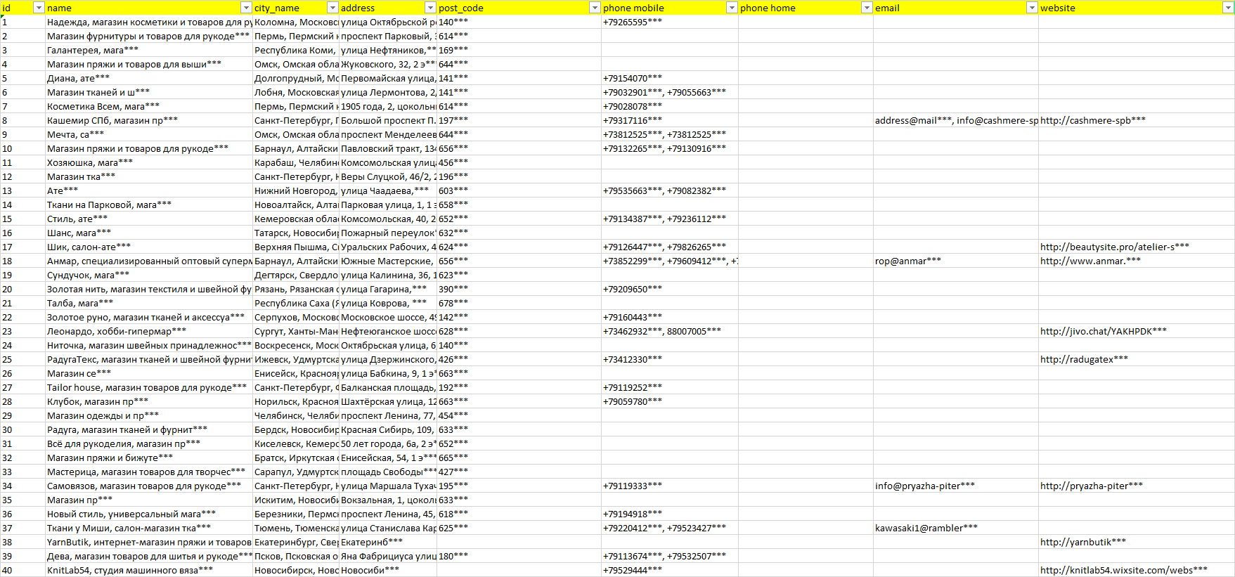 База компаний пряжа, вся РФ в формате Excel с эл. почтами, телефонами, сайтами, ссылками на соц сети, координатами и другой информацией. Скачайте демо версию, чтобы ознакомиться с данными.