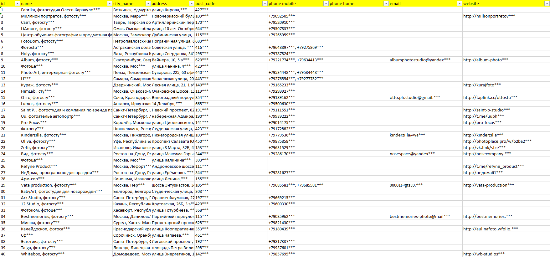 База компаний фотостудии, вся РФ в формате Excel с эл. почтами, телефонами, сайтами, ссылками на соц сети, координатами и другой информацией. Скачайте демо версию, чтобы ознакомиться с данными.
