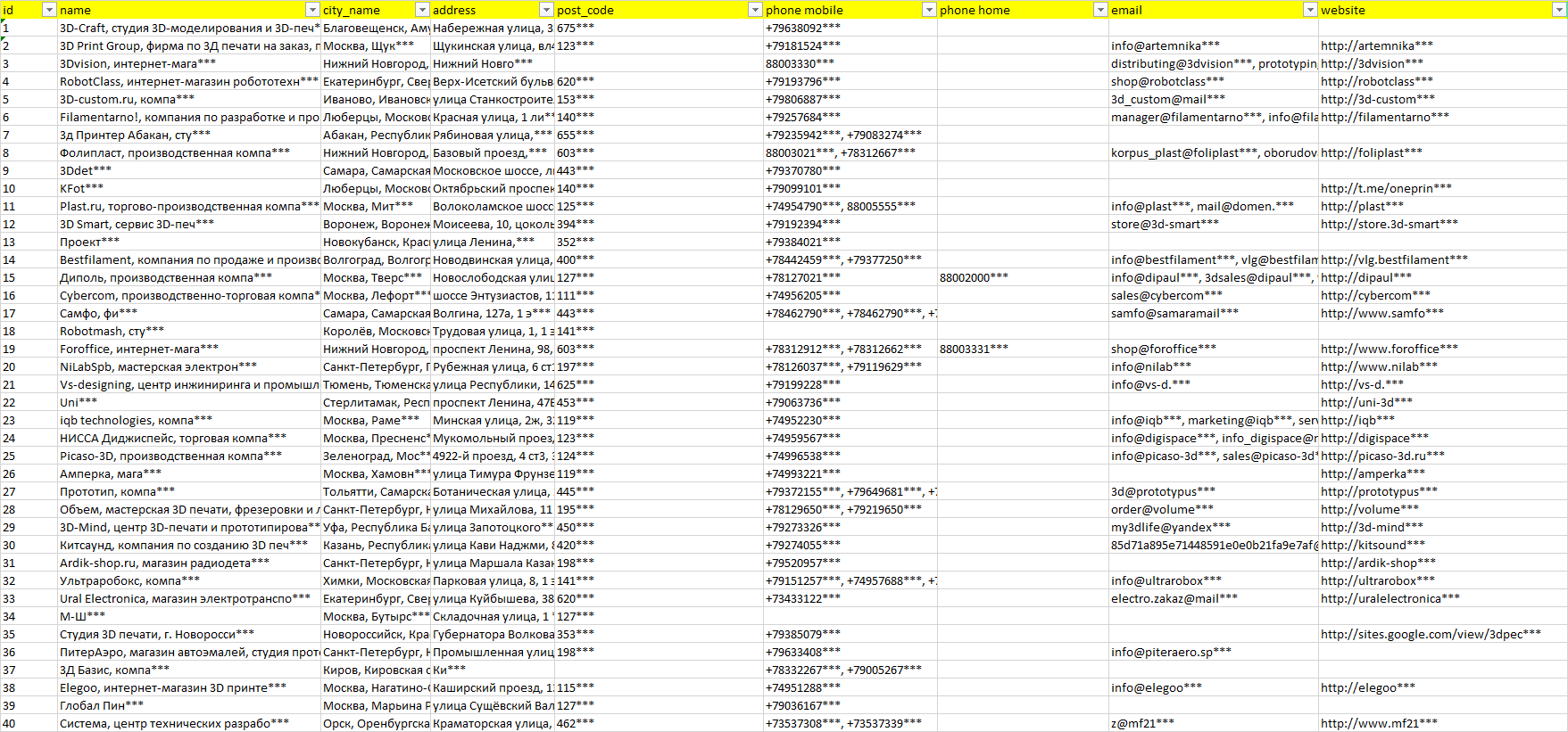 База компаний оборудование для 3d печати, вся РФ в формате Excel с эл. почтами, телефонами, сайтами, ссылками на соц сети, координатами и другой информацией. Скачайте демо версию, чтобы ознакомиться с данными.
