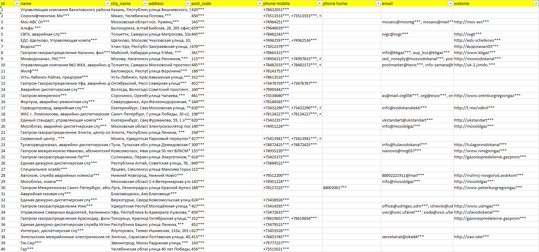 База компаний аварийные службы, вся РФ в формате Excel с эл. почтами, телефонами, сайтами, ссылками на соц сети, координатами и другой информацией. Скачайте демо версию, чтобы ознакомиться с данными.