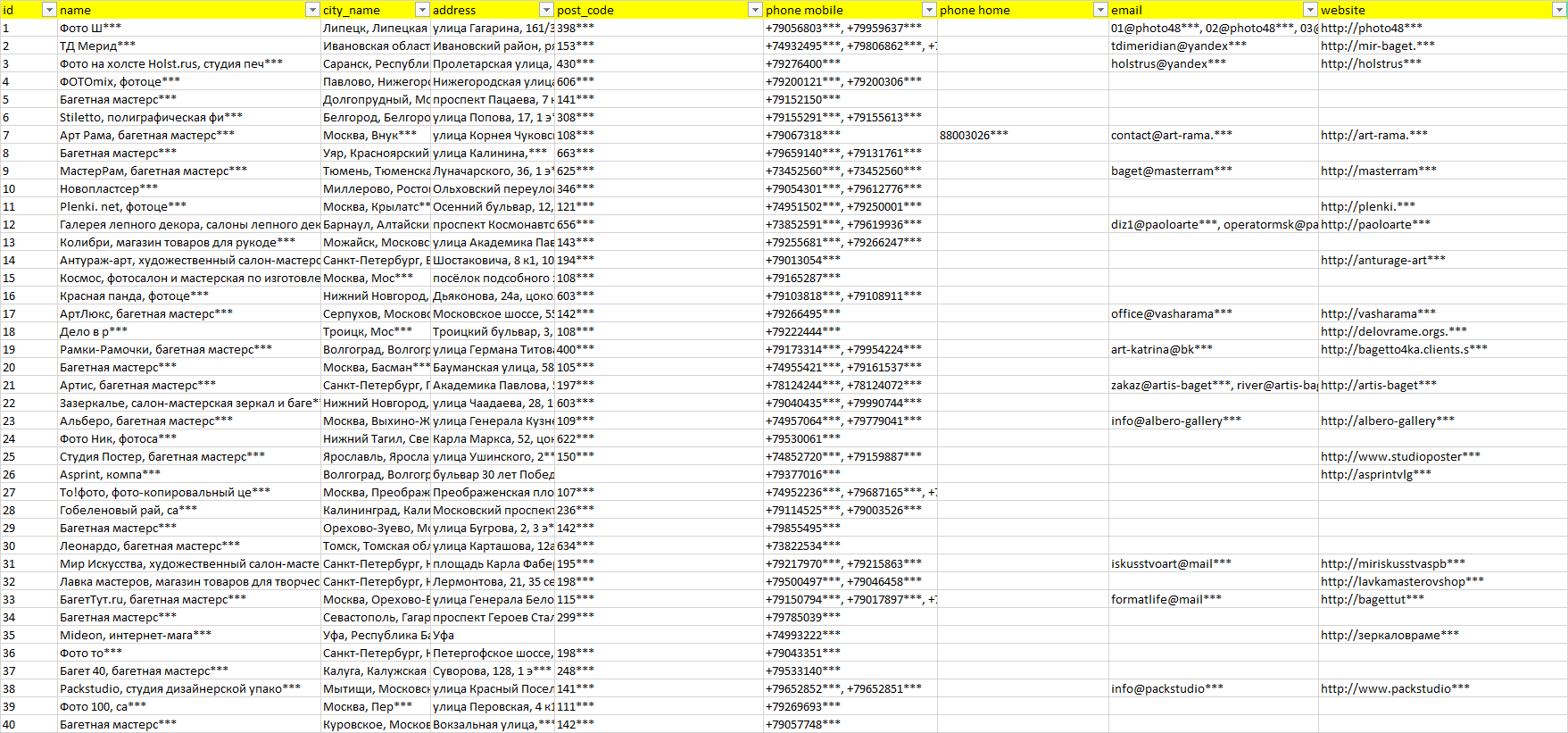 База компаний багетные мастерские, вся РФ в формате Excel с эл. почтами, телефонами, сайтами, ссылками на соц сети, координатами и другой информацией. Скачайте демо версию, чтобы ознакомиться с данными.