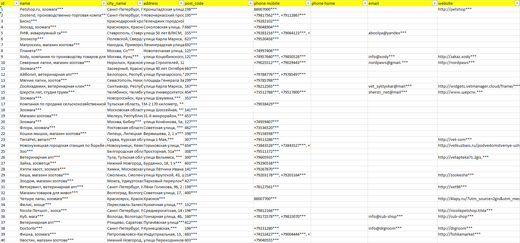 База организаций зоотовары, вся Россия в формате Excel с эл. почтами, телефонами, сайтами, ссылками на соц сети, координатами и другой информацией. Скачайте демо версию, чтобы ознакомиться с данными.
