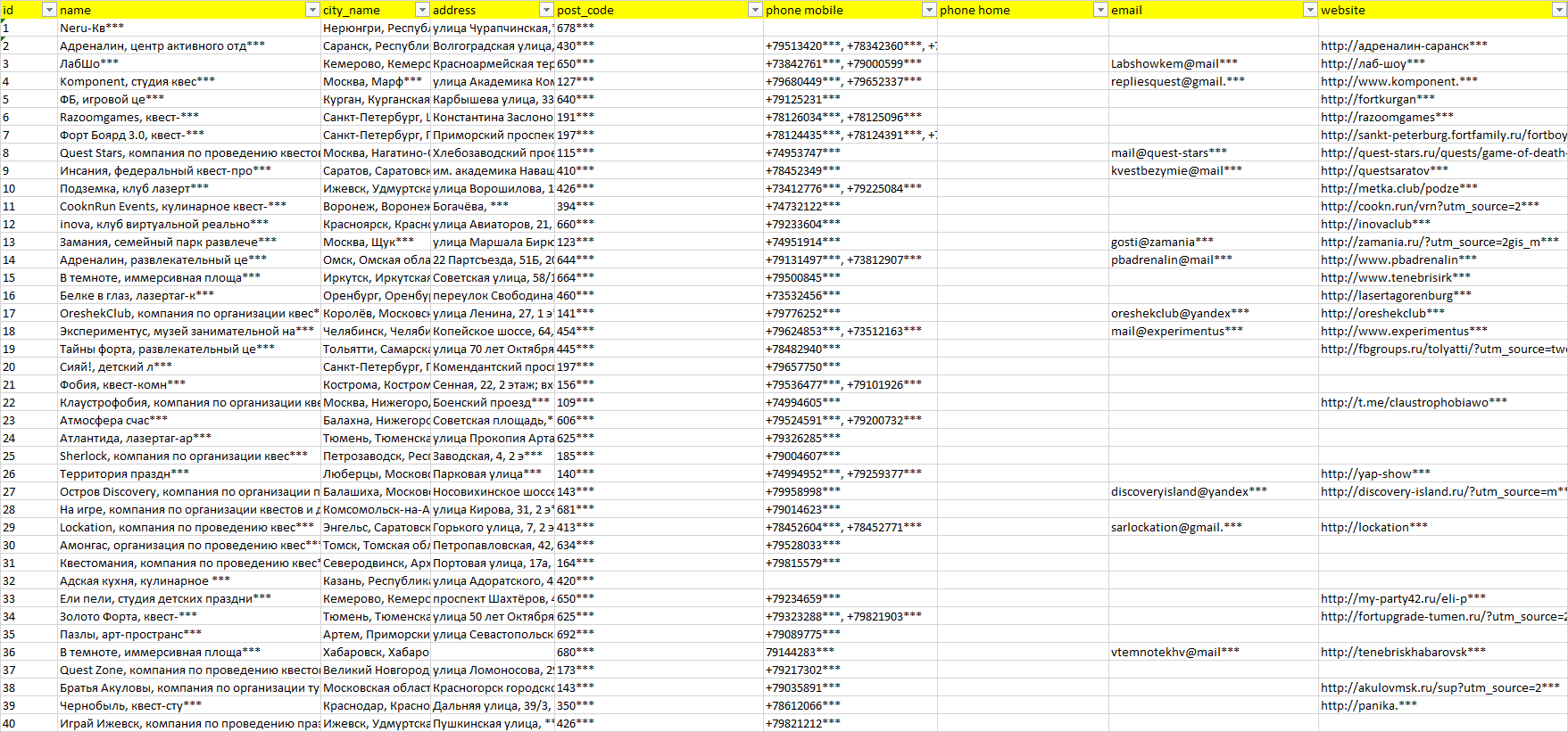 База компаний квесты, вся РФ в формате Excel с эл. почтами, телефонами, сайтами, ссылками на соц сети, координатами и другой информацией. Скачайте демо версию, чтобы ознакомиться с данными.