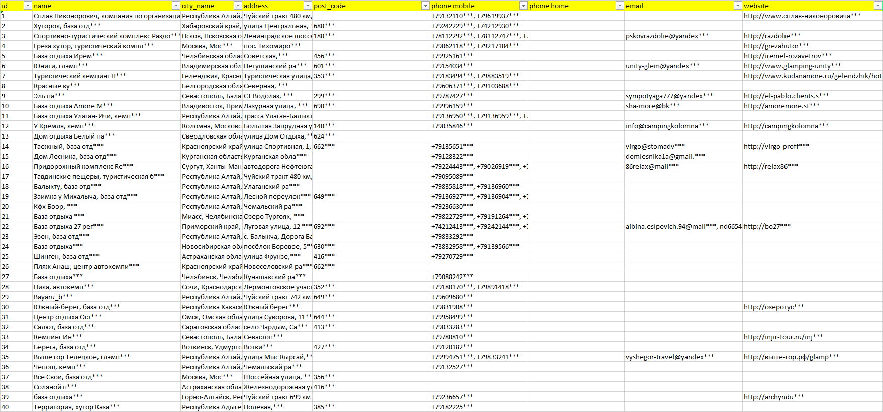База организаций кемпинги, вся Россия в формате Excel с эл. почтами, телефонами, сайтами, ссылками на соц сети, координатами и другой информацией. Скачайте демо версию, чтобы ознакомиться с данными.