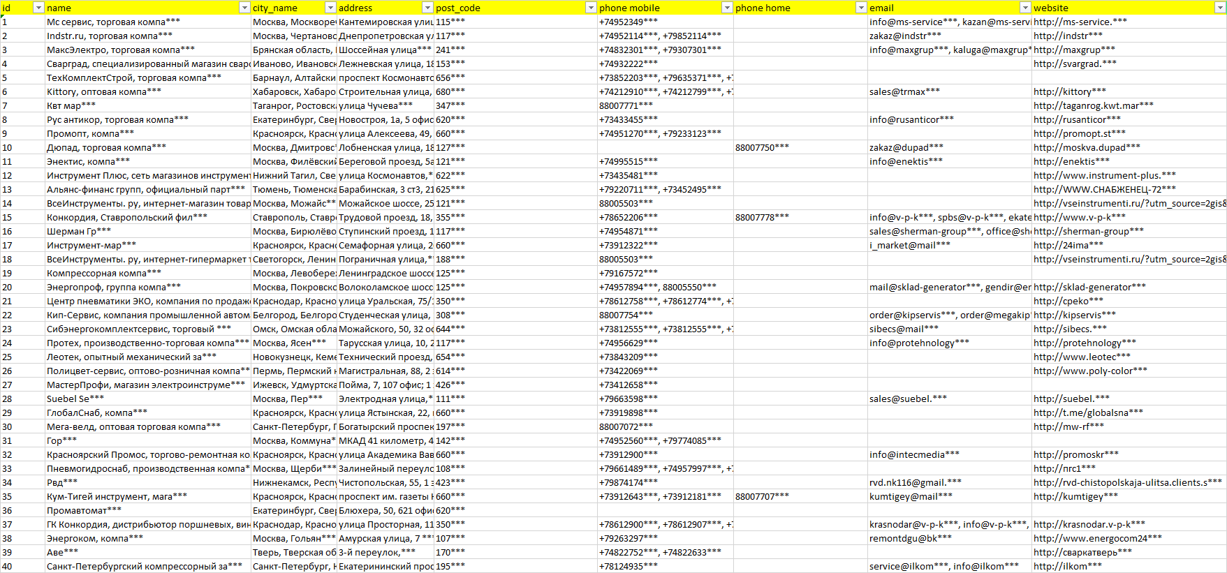 Мы автоматически собираем такие данные с различных открытых источников, обрабатываем, структурирует и упорядочиваем их, предоставляя пользователю возможность скачать результат в формате Excel. По принципу работы наш сервис аналогичен поисковым системам, таким как Google или Яндекс, но с возможностью экспорта найденной информации в удобном табличном виде.