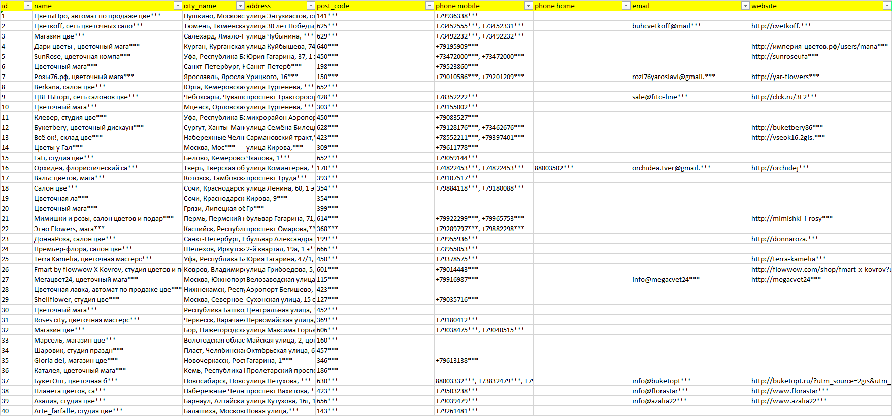 База организаций цветы, вся Россия в формате Excel с эл. почтами, телефонами, сайтами, ссылками на соц сети, координатами и другой информацией. Скачайте демо версию, чтобы ознакомиться с данными.