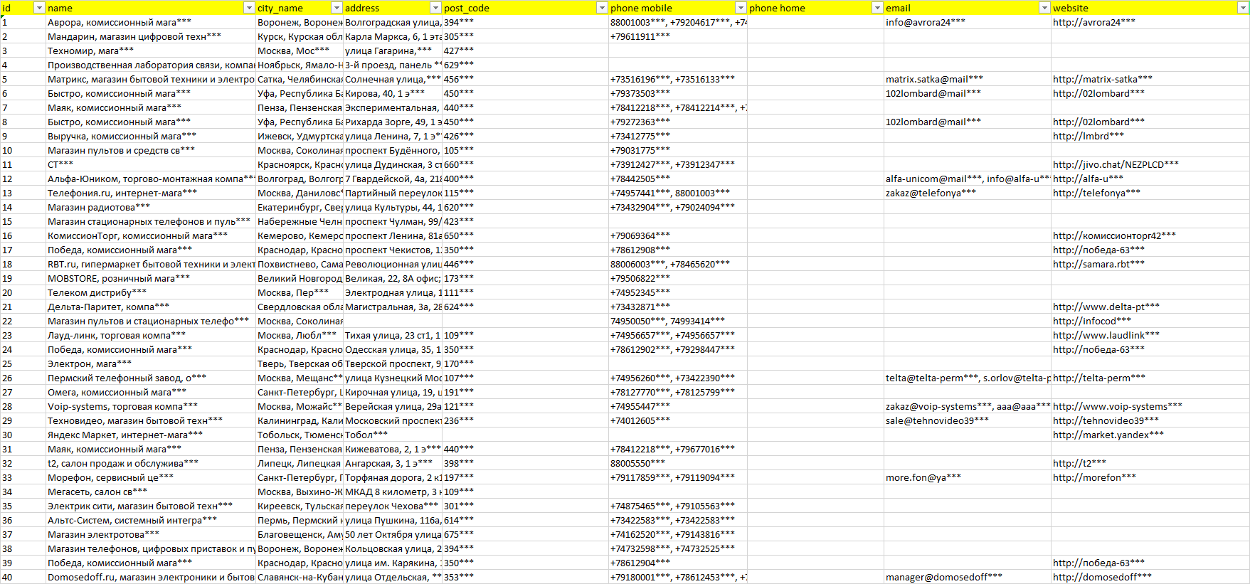 База компаний стационарные телефоны, вся РФ в формате Excel с эл. почтами, телефонами, сайтами, ссылками на соц сети, координатами и другой информацией. Скачайте демо версию, чтобы ознакомиться с данными.