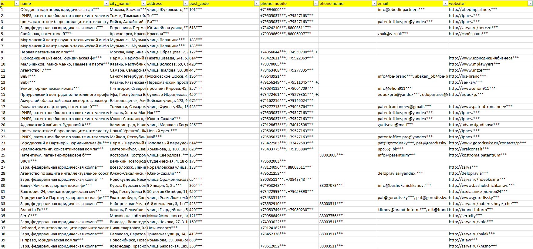База организаций патентные услуги, вся Россия в формате Excel с эл. почтами, телефонами, сайтами, ссылками на соц сети, координатами и другой информацией. Скачайте демо версию, чтобы ознакомиться с данными.