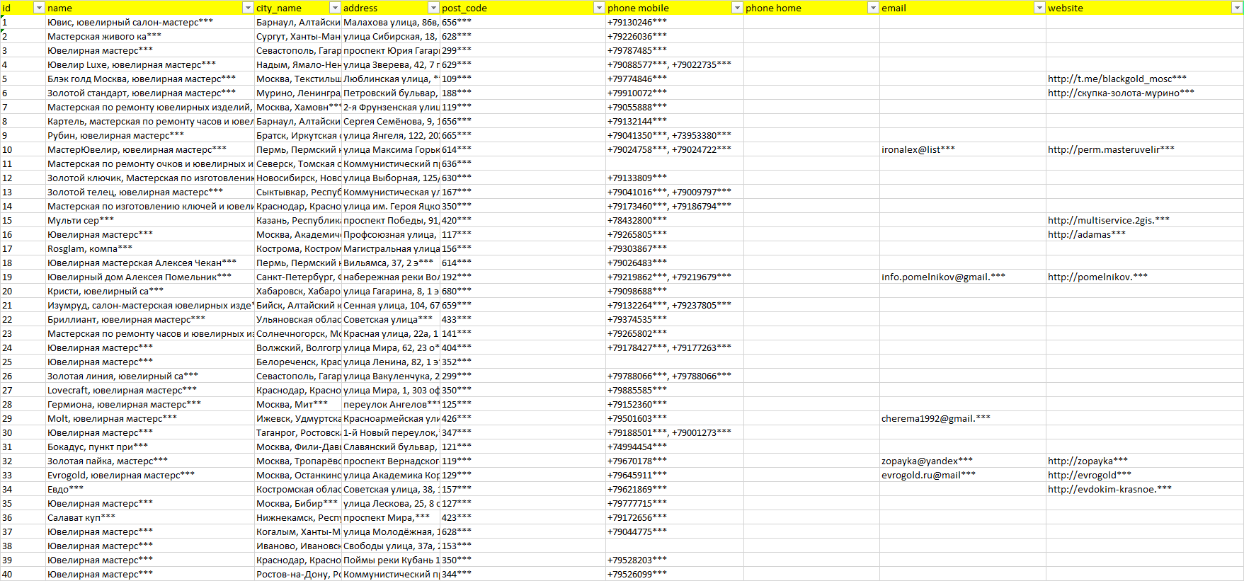 База организаций ювелирные мастерские, вся Россия в формате Excel с эл. почтами, телефонами, сайтами, ссылками на соц сети, координатами и другой информацией. Скачайте демо версию, чтобы ознакомиться с данными.