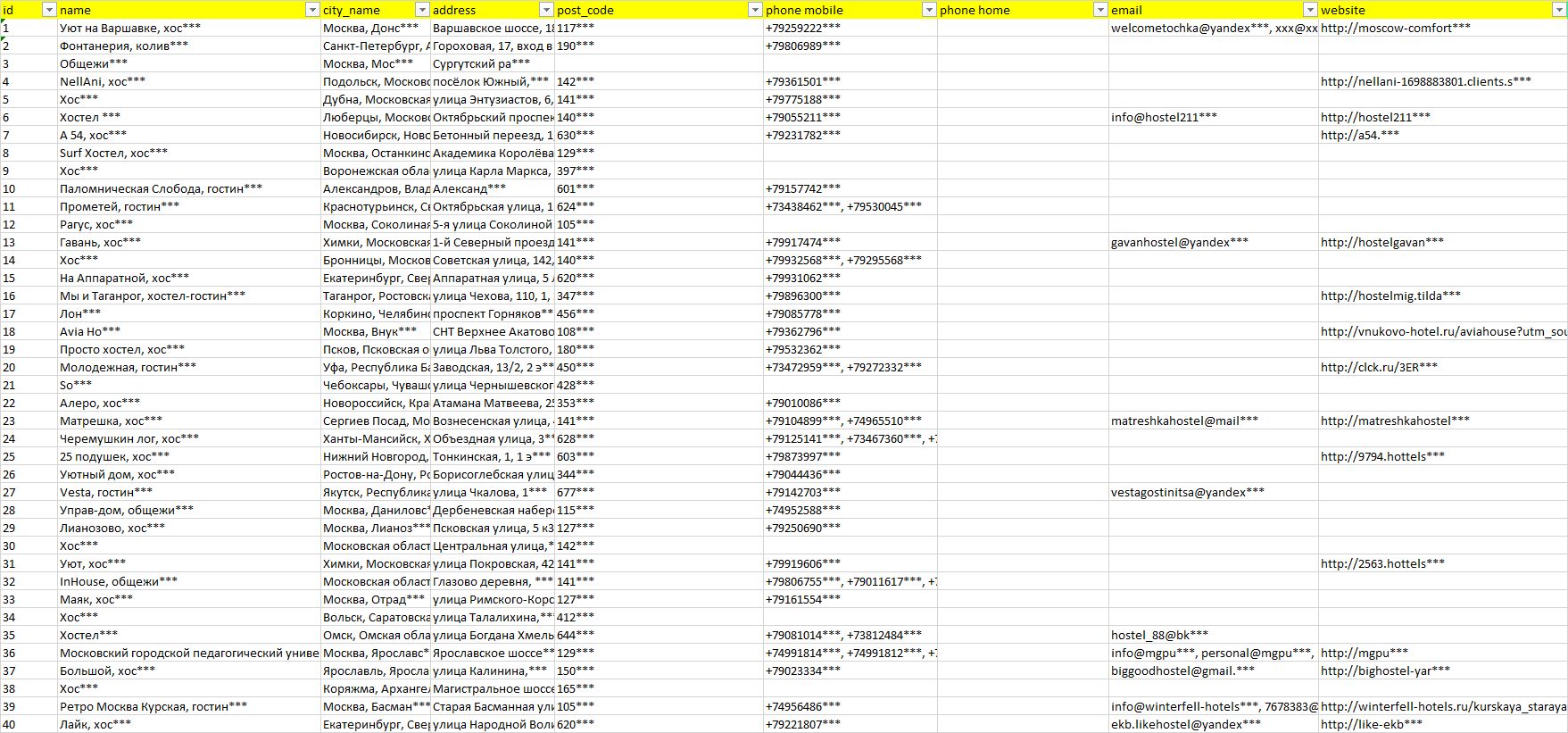 База организаций хостелы, вся Россия в формате Excel с эл. почтами, телефонами, сайтами, ссылками на соц сети, координатами и другой информацией. Скачайте демо версию, чтобы ознакомиться с данными.