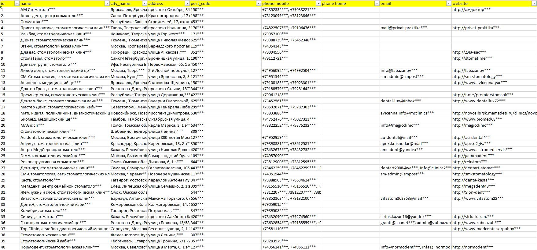 База организаций частные стоматологии, вся Россия в формате Excel с эл. почтами, телефонами, сайтами, ссылками на соц сети, координатами и другой информацией. Скачайте демо версию, чтобы ознакомиться с данными.