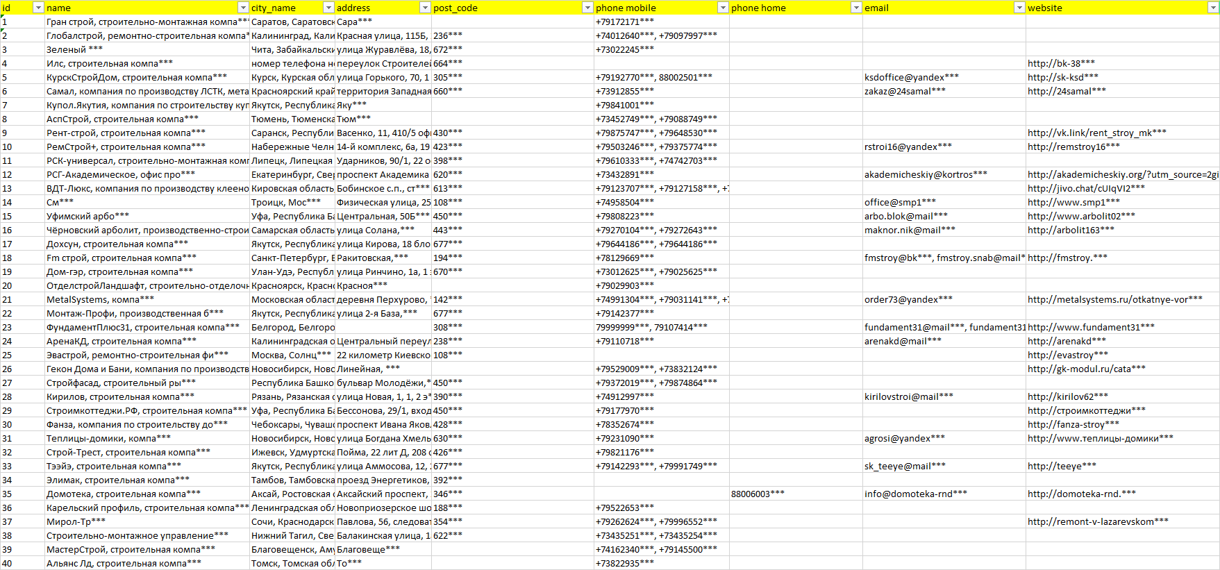 База компаний строительство гаражей, вся РФ в формате Excel с эл. почтами, телефонами, сайтами, ссылками на соц сети, координатами и другой информацией. Скачайте демо версию, чтобы ознакомиться с данными.