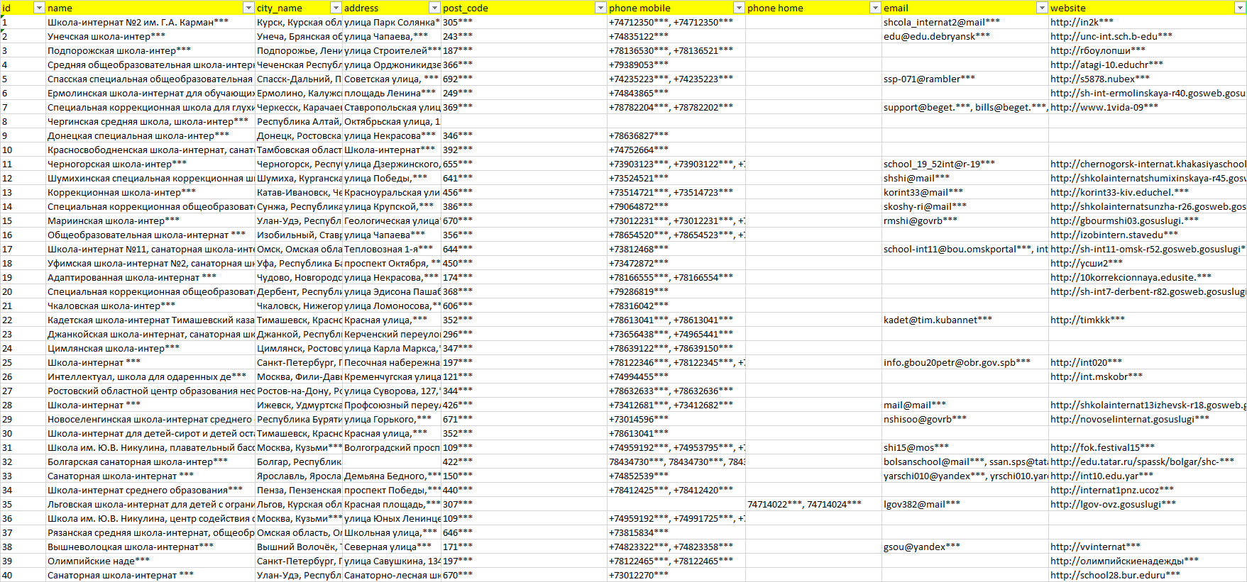 База организаций школы-интернаты, вся Россия в формате Excel с эл. почтами, телефонами, сайтами, ссылками на соц сети, координатами и другой информацией. Скачайте демо версию, чтобы ознакомиться с данными.
