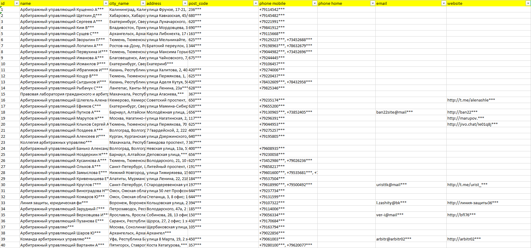 База организаций арбитражный управляющий, вся Россия в формате Excel с эл. почтами, телефонами, сайтами, ссылками на соц сети, координатами и другой информацией. Скачайте демо версию, чтобы ознакомиться с данными.