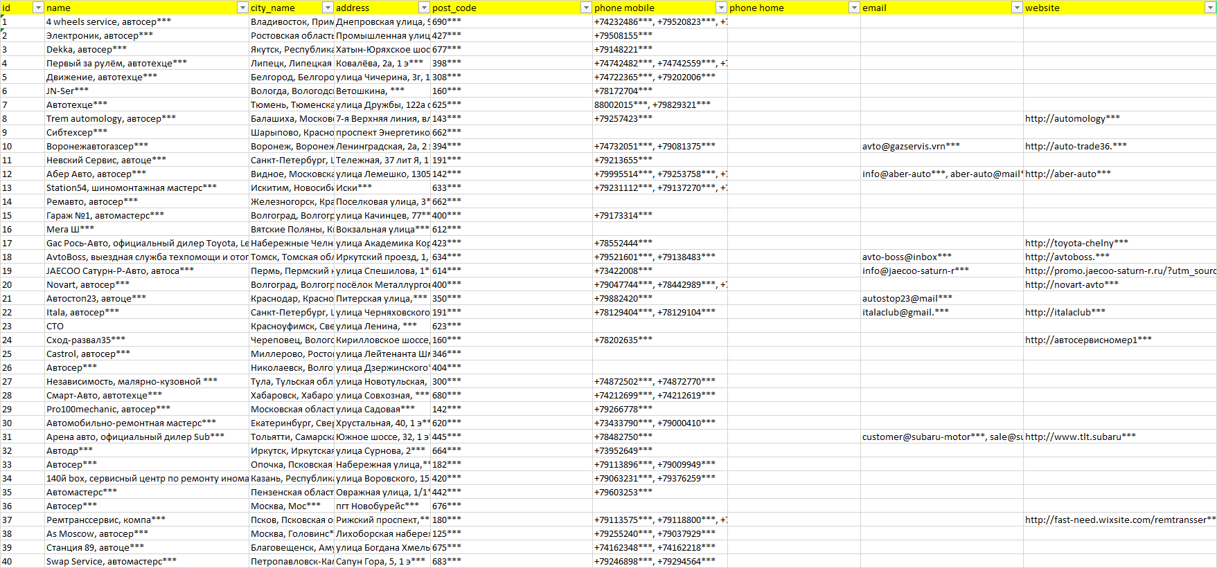 База организаций легковой автосервис, вся Россия в формате Excel с эл. почтами, телефонами, сайтами, ссылками на соц сети, координатами и другой информацией. Скачайте демо версию, чтобы ознакомиться с данными.