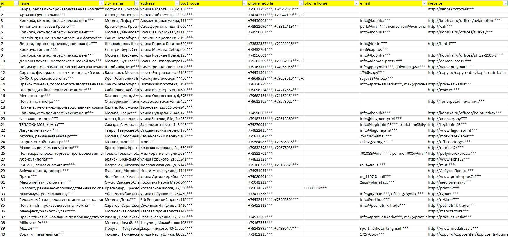 База компаний флексопечать, вся РФ в формате Excel с эл. почтами, телефонами, сайтами, ссылками на соц сети, координатами и другой информацией. Скачайте демо версию, чтобы ознакомиться с данными.