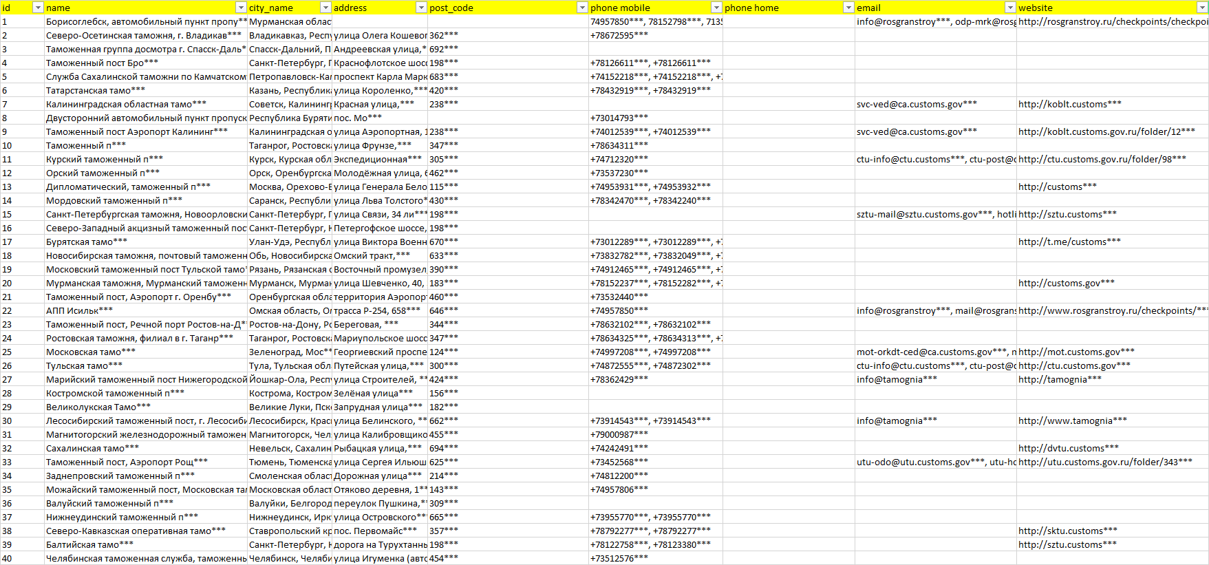 База организаций таможня, вся Россия в формате Excel с эл. почтами, телефонами, сайтами, ссылками на соц сети, координатами и другой информацией. Скачайте демо версию, чтобы ознакомиться с данными.
