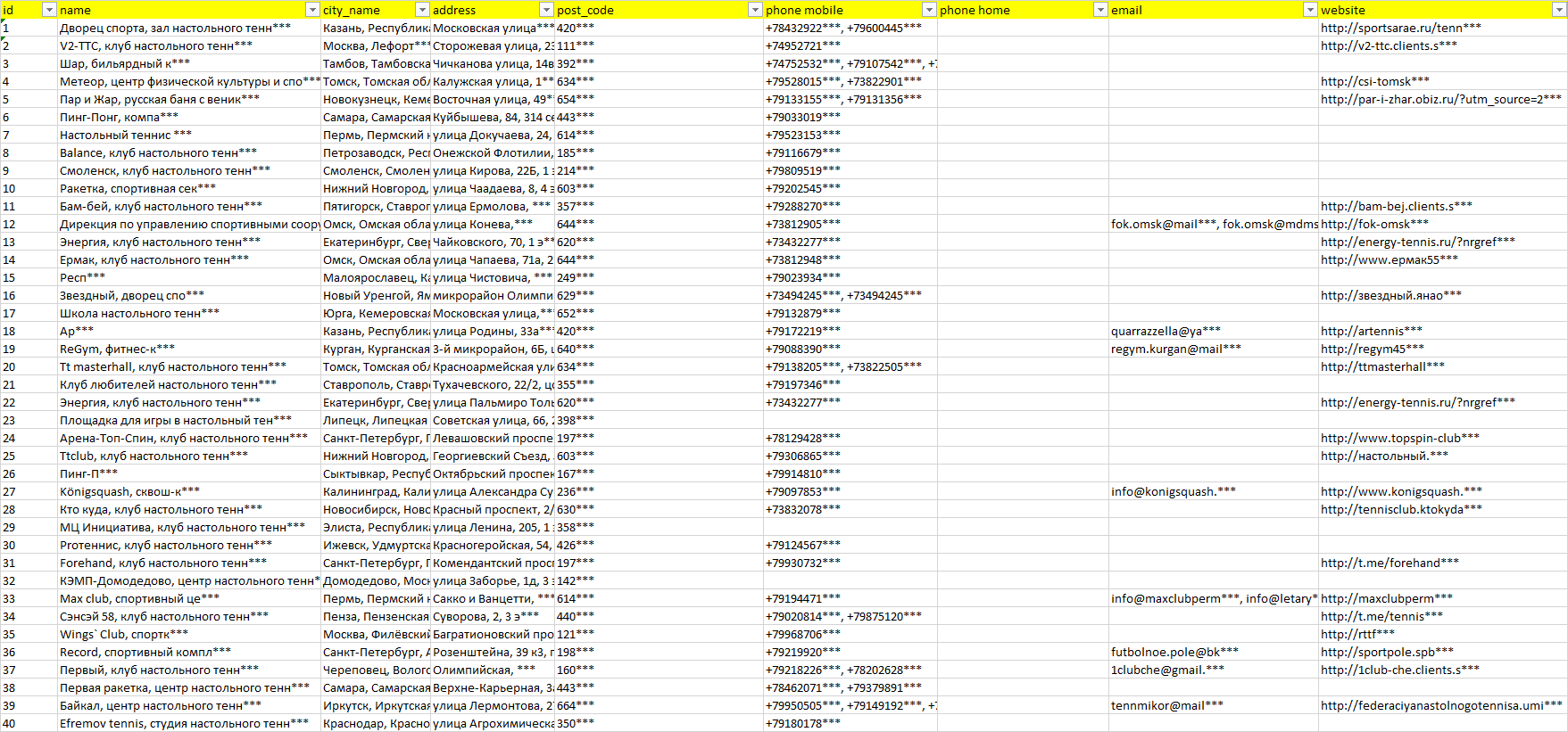 База организаций клубы настольного тенниса, вся Россия в формате Excel с эл. почтами, телефонами, сайтами, ссылками на соц сети, координатами и другой информацией. Скачайте демо версию, чтобы ознакомиться с данными.
