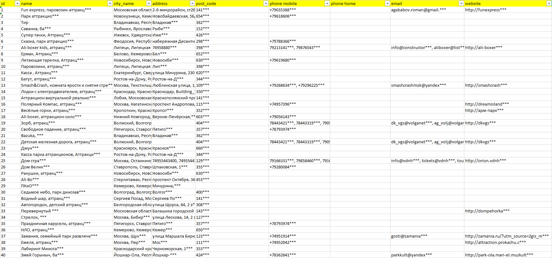База организаций аттракционы, вся Россия в формате Excel с эл. почтами, телефонами, сайтами, ссылками на соц сети, координатами и другой информацией. Скачайте демо версию, чтобы ознакомиться с данными.