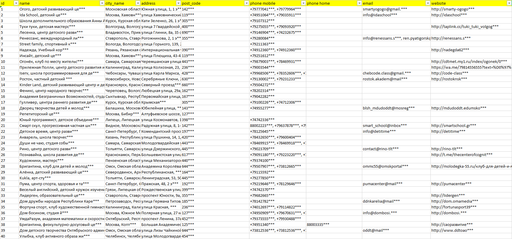 База компаний курсы творчества для детей, вся РФ в формате Excel с эл. почтами, телефонами, сайтами, ссылками на соц сети, координатами и другой информацией. Скачайте демо версию, чтобы ознакомиться с данными.