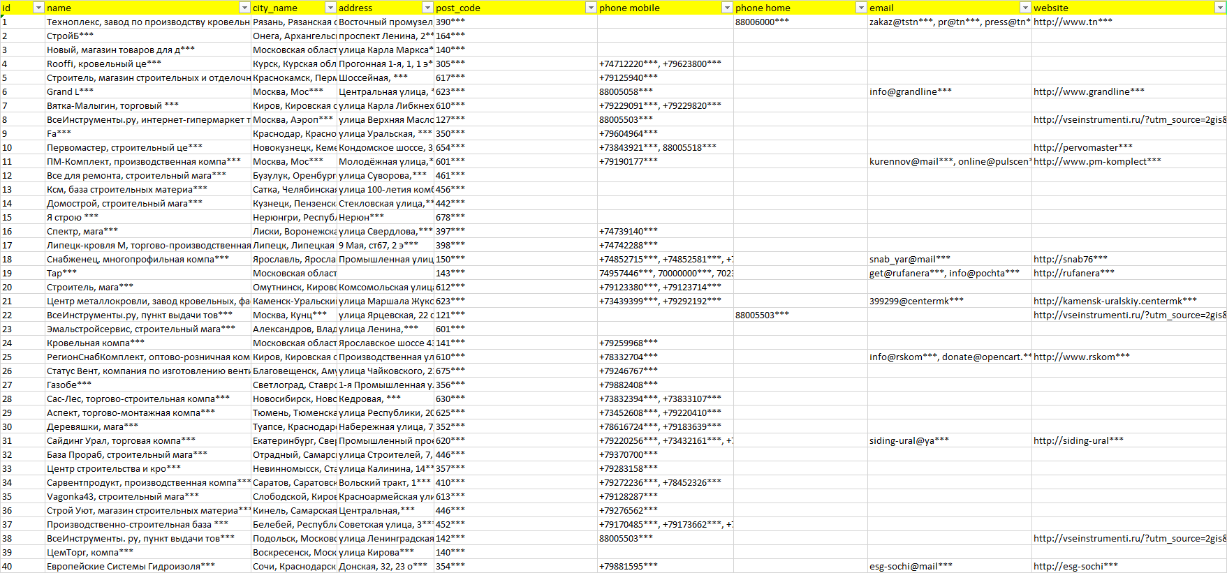 База организаций кровельные материалы, вся Россия в формате Excel с эл. почтами, телефонами, сайтами, ссылками на соц сети, координатами и другой информацией. Скачайте демо версию, чтобы ознакомиться с данными.