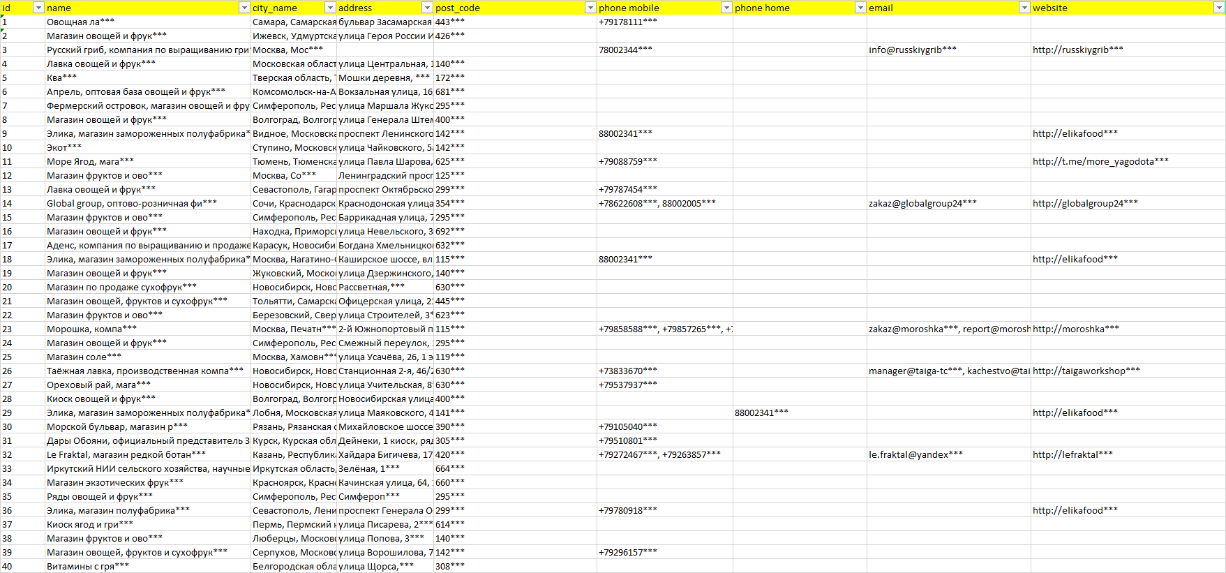 База компаний ягоды и грибы, вся РФ в формате Excel с эл. почтами, телефонами, сайтами, ссылками на соц сети, координатами и другой информацией. Скачайте демо версию, чтобы ознакомиться с данными.