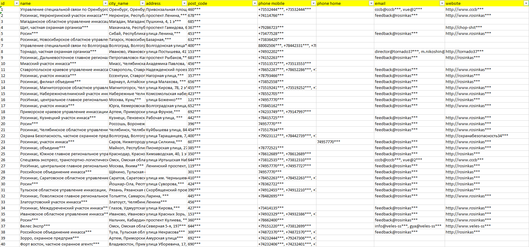 База организаций услуги инкассации, вся Россия в формате Excel с эл. почтами, телефонами, сайтами, ссылками на соц сети, координатами и другой информацией. Скачайте демо версию, чтобы ознакомиться с данными.