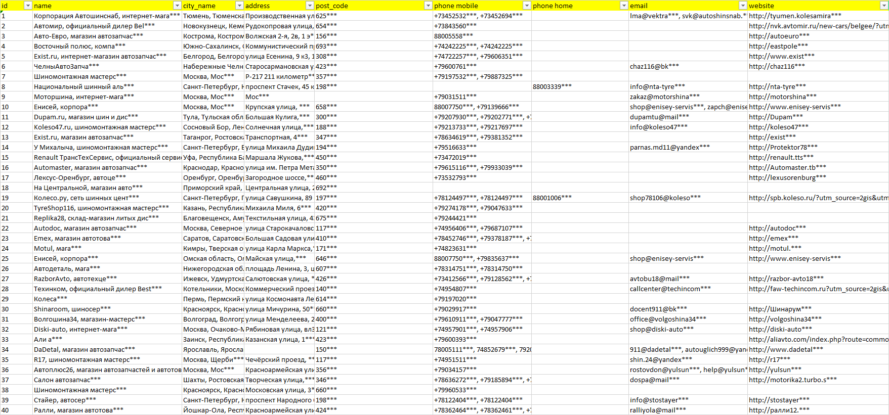 База организаций шины и диски, вся Россия в формате Excel с эл. почтами, телефонами, сайтами, ссылками на соц сети, координатами и другой информацией. Скачайте демо версию, чтобы ознакомиться с данными.