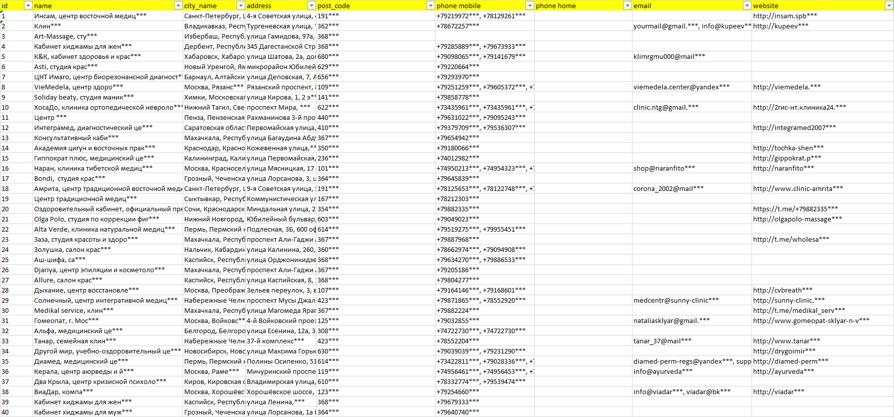 База компаний альтернативная медицина, вся РФ в формате Excel с эл. почтами, телефонами, сайтами, ссылками на соц сети, координатами и другой информацией. Скачайте демо версию, чтобы ознакомиться с данными.