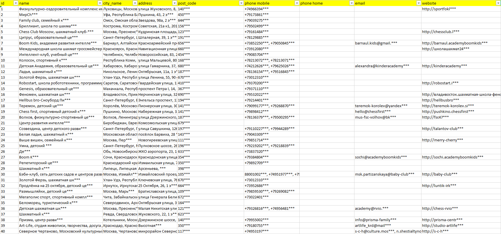 База организаций спортивно-интеллектуальные клубы, вся Россия в формате Excel с эл. почтами, телефонами, сайтами, ссылками на соц сети, координатами и другой информацией. Скачайте демо версию, чтобы ознакомиться с данными.