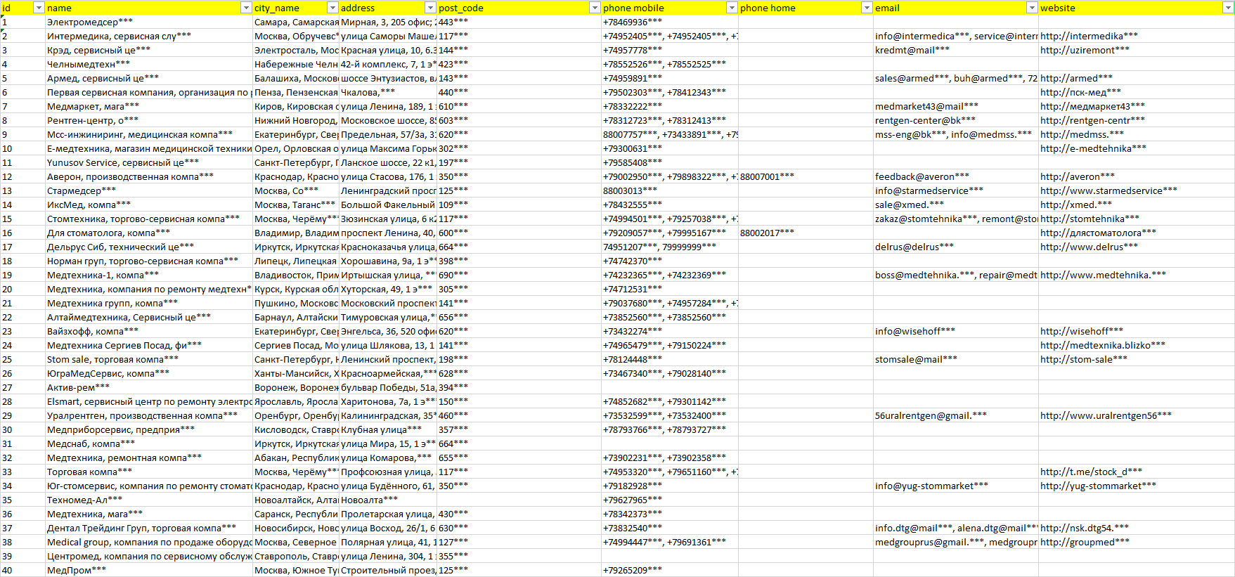 База компаний ремонт медицинского оборудования, вся РФ в формате Excel с эл. почтами, телефонами, сайтами, ссылками на соц сети, координатами и другой информацией. Скачайте демо версию, чтобы ознакомиться с данными.