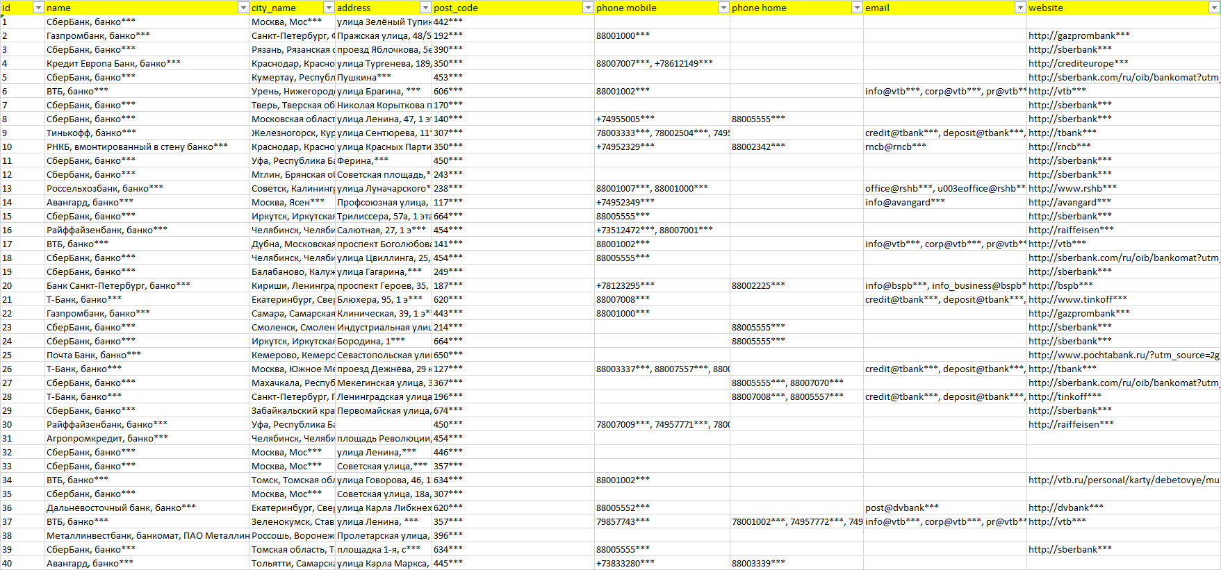 База компаний банкоматы, вся РФ в формате Excel с эл. почтами, телефонами, сайтами, ссылками на соц сети, координатами и другой информацией. Скачайте демо версию, чтобы ознакомиться с данными.