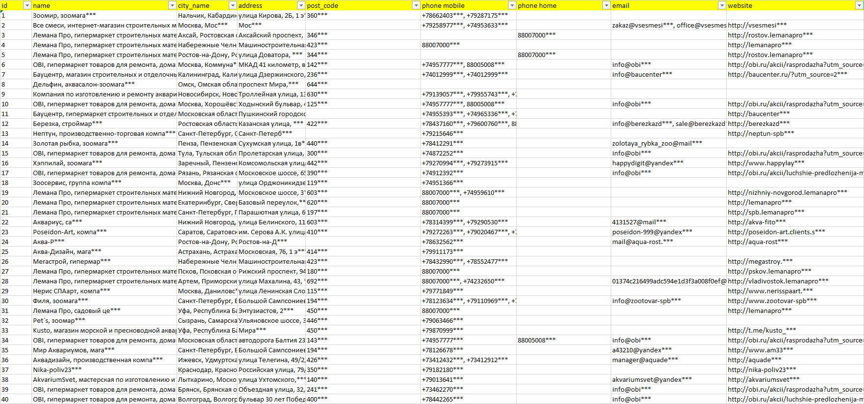 Мы автоматически собираем такие данные с различных открытых источников, обрабатываем, структурирует и упорядочиваем их, предоставляя пользователю возможность скачать результат в формате Excel. По принципу работы наш сервис аналогичен поисковым системам, таким как Google или Яндекс, но с возможностью экспорта найденной информации в удобном табличном виде.
