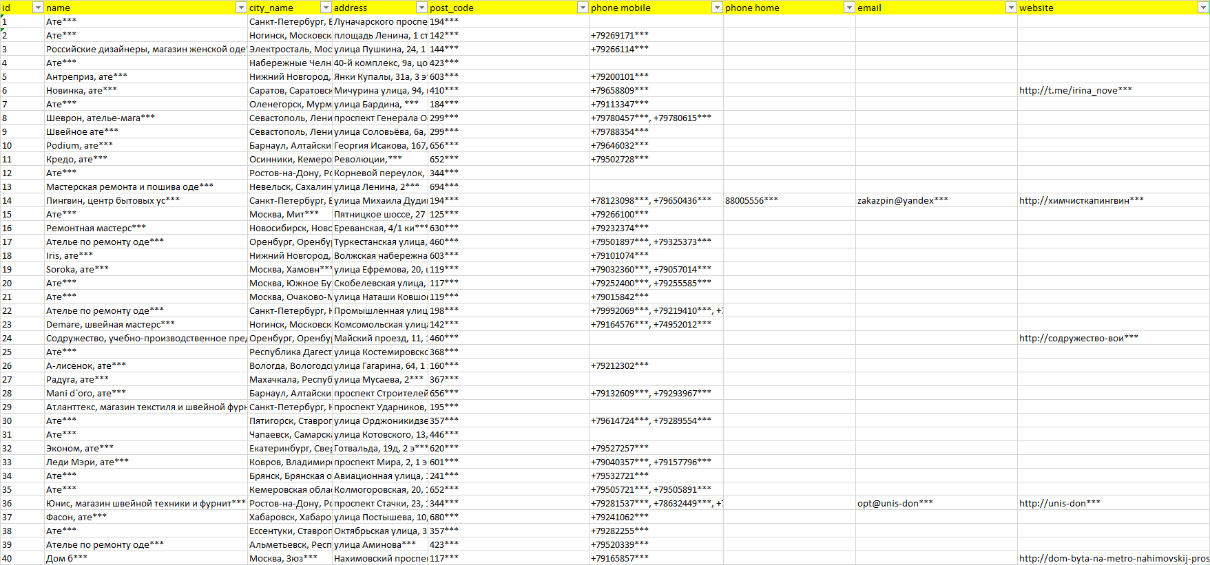 База компаний швейные ателье, вся РФ в формате Excel с эл. почтами, телефонами, сайтами, ссылками на соц сети, координатами и другой информацией. Скачайте демо версию, чтобы ознакомиться с данными.