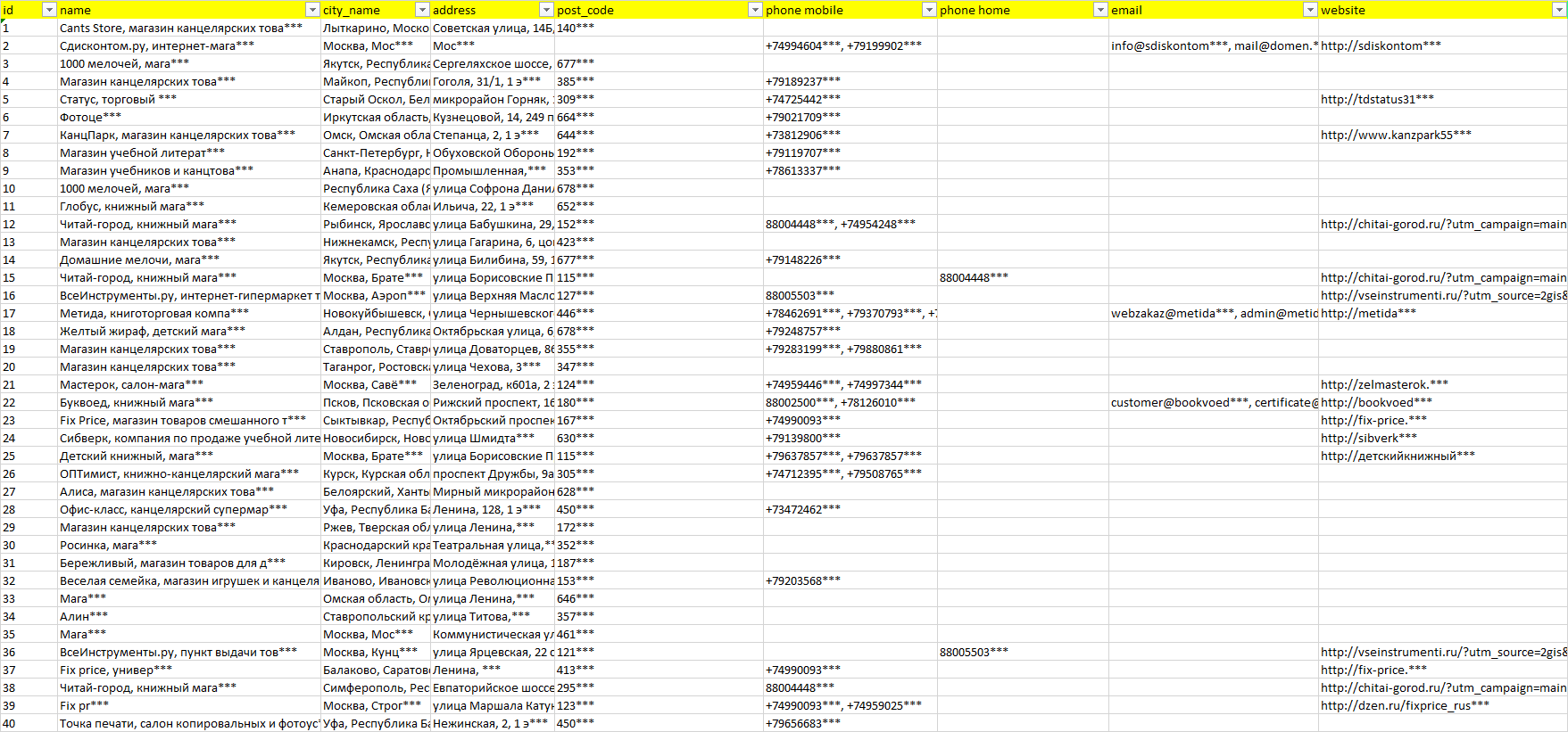 База организаций канцтовары, вся Россия в формате Excel с эл. почтами, телефонами, сайтами, ссылками на соц сети, координатами и другой информацией. Скачайте демо версию, чтобы ознакомиться с данными.
