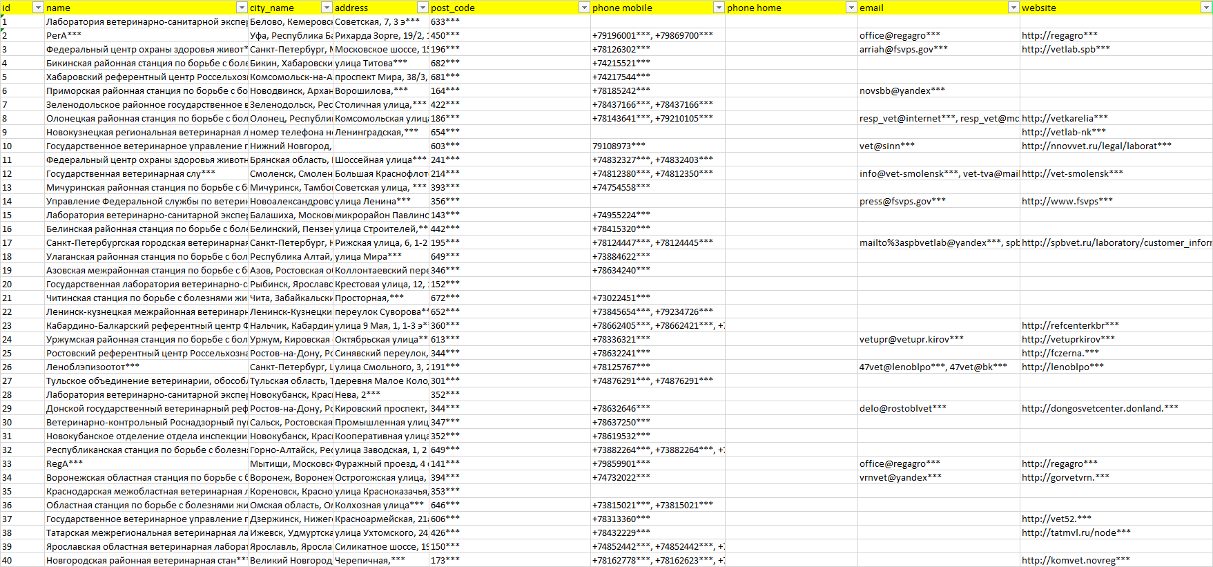 База организаций отделы ветеринарно-санитарного контроля, вся Россия в формате Excel с эл. почтами, телефонами, сайтами, ссылками на соц сети, координатами и другой информацией. Скачайте демо версию, чтобы ознакомиться с данными.