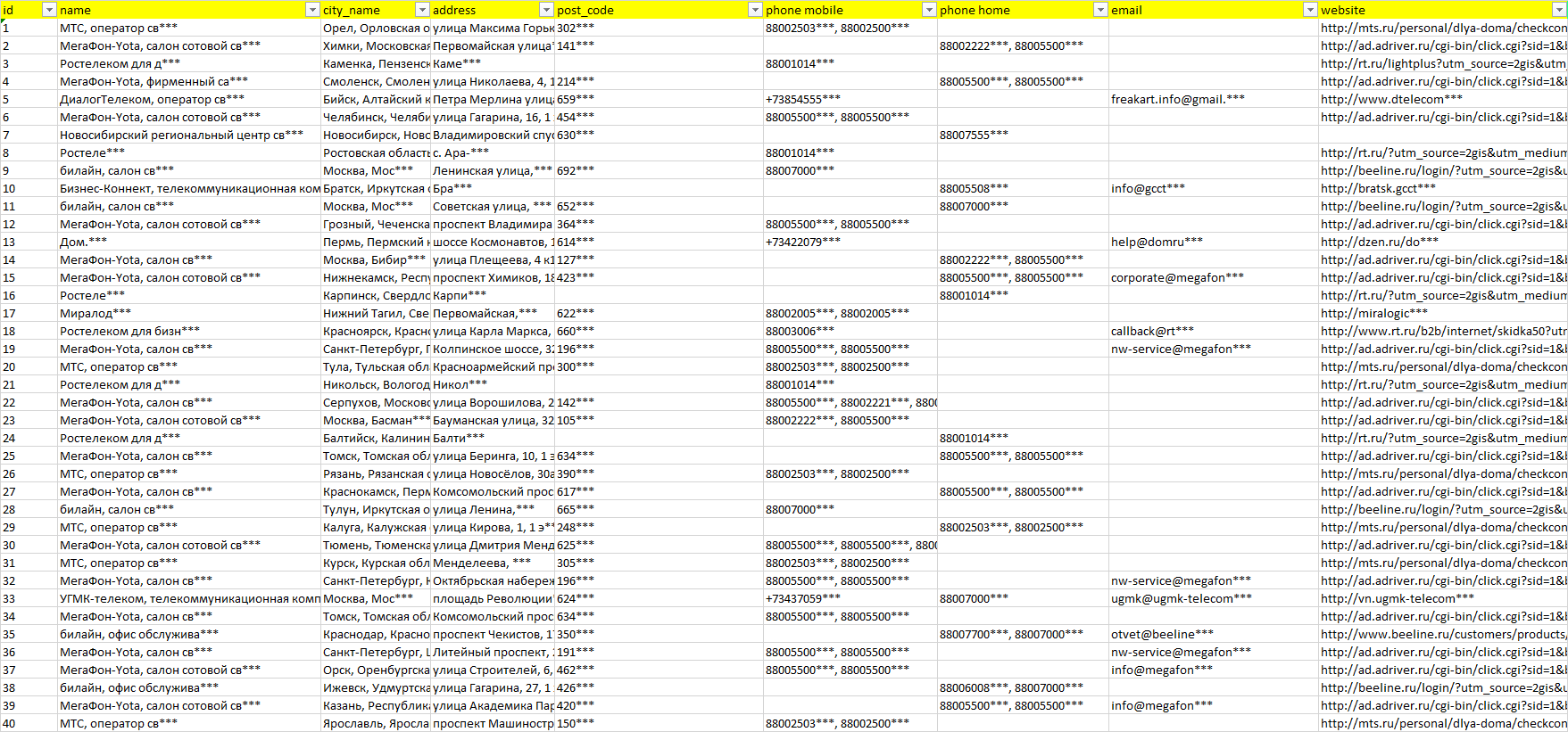 База компаний услуги телефонной связи, вся РФ в формате Excel с эл. почтами, телефонами, сайтами, ссылками на соц сети, координатами и другой информацией. Скачайте демо версию, чтобы ознакомиться с данными.