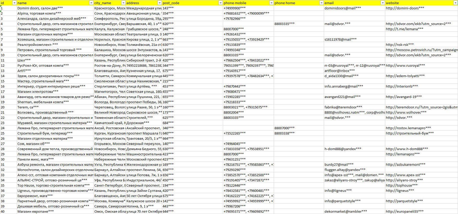 База компаний стеновые панели, вся РФ в формате Excel с эл. почтами, телефонами, сайтами, ссылками на соц сети, координатами и другой информацией. Скачайте демо версию, чтобы ознакомиться с данными.