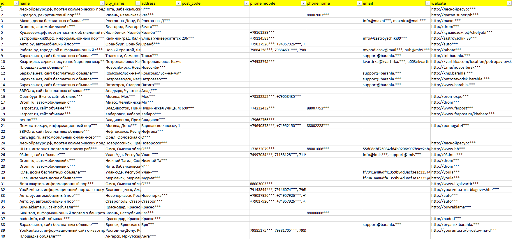 База организаций сайты объявлений, вся Россия в формате Excel с эл. почтами, телефонами, сайтами, ссылками на соц сети, координатами и другой информацией. Скачайте демо версию, чтобы ознакомиться с данными.