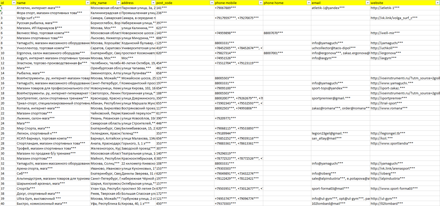 База организаций спортивное оборудование, вся Россия в формате Excel с эл. почтами, телефонами, сайтами, ссылками на соц сети, координатами и другой информацией. Скачайте демо версию, чтобы ознакомиться с данными.