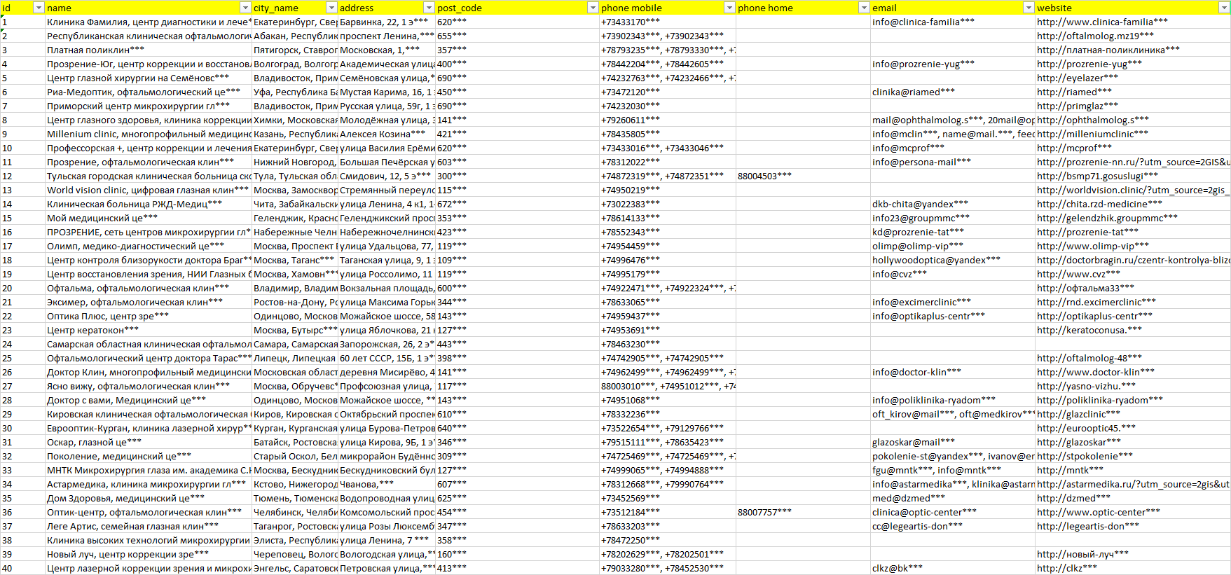 База организаций микрохирургия глаза, вся Россия в формате Excel с эл. почтами, телефонами, сайтами, ссылками на соц сети, координатами и другой информацией. Скачайте демо версию, чтобы ознакомиться с данными.