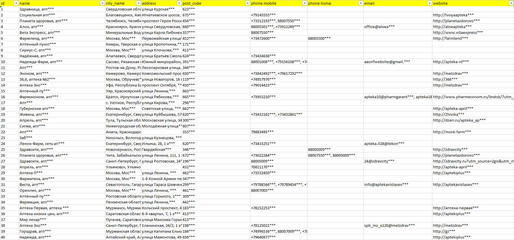 База компаний аптеки, вся РФ в формате Excel с эл. почтами, телефонами, сайтами, ссылками на соц сети, координатами и другой информацией. Скачайте демо версию, чтобы ознакомиться с данными.