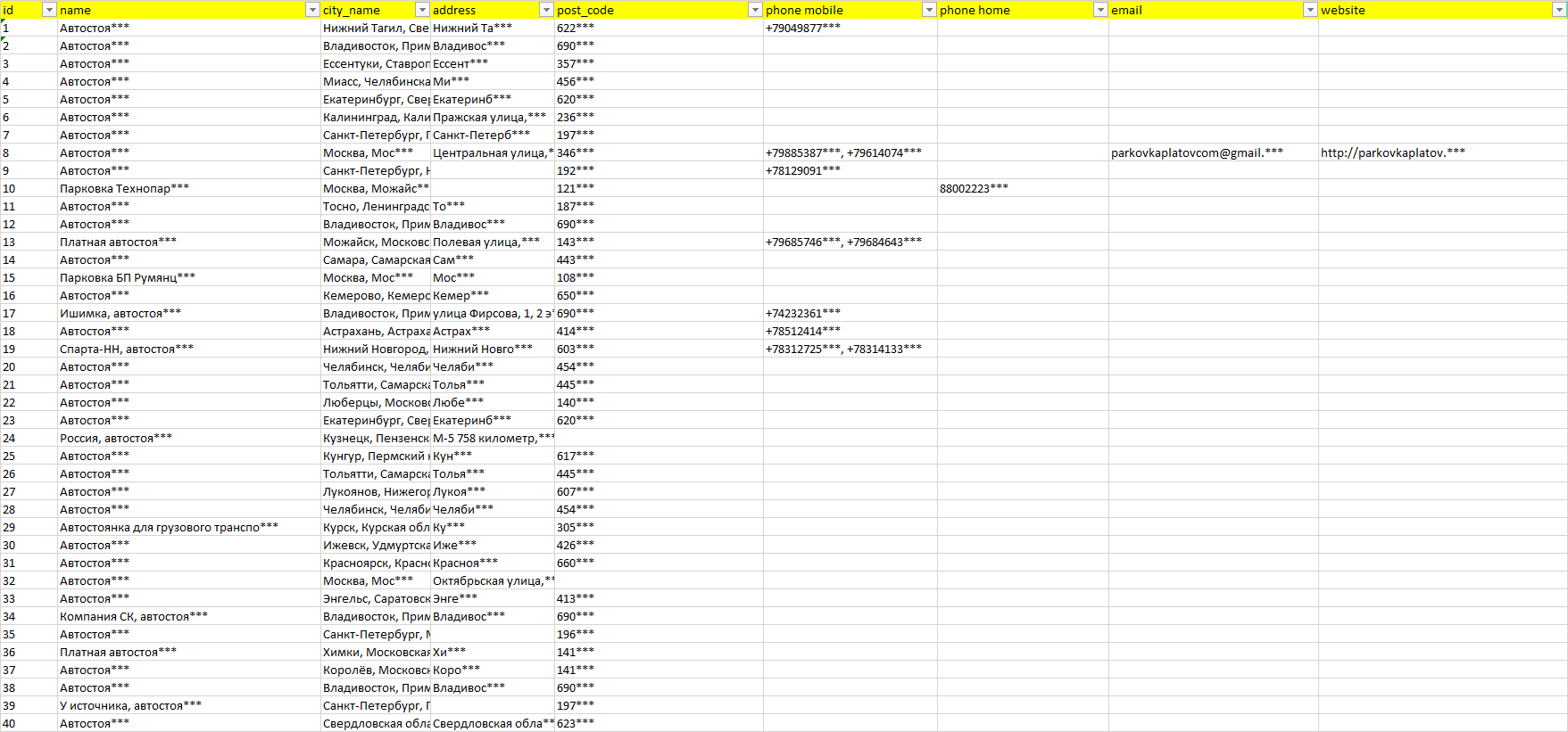 База компаний автостоянки, вся РФ в формате Excel с эл. почтами, телефонами, сайтами, ссылками на соц сети, координатами и другой информацией. Скачайте демо версию, чтобы ознакомиться с данными.