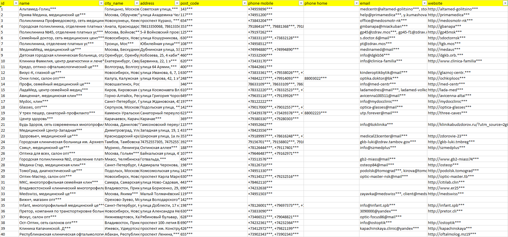 База компаний офтальмолог, вся РФ в формате Excel с эл. почтами, телефонами, сайтами, ссылками на соц сети, координатами и другой информацией. Скачайте демо версию, чтобы ознакомиться с данными.