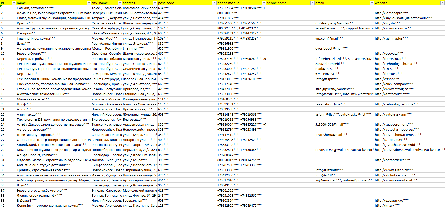 База компаний звукоизоляционные работы, вся РФ в формате Excel с эл. почтами, телефонами, сайтами, ссылками на соц сети, координатами и другой информацией. Скачайте демо версию, чтобы ознакомиться с данными.