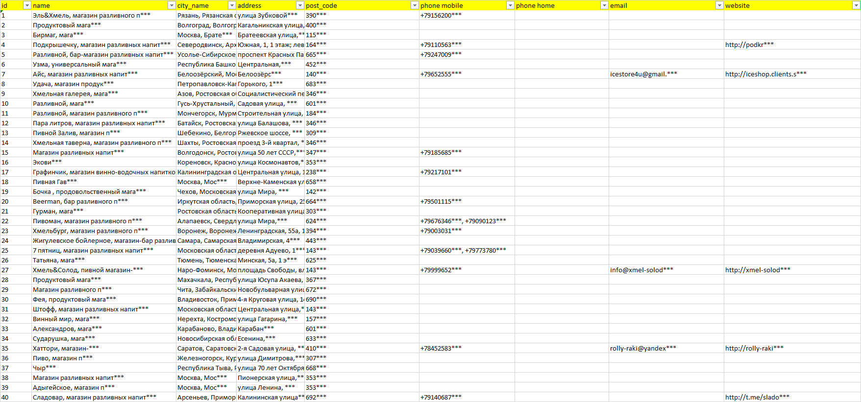 База компаний разливное пиво, вся РФ в формате Excel с эл. почтами, телефонами, сайтами, ссылками на соц сети, координатами и другой информацией. Скачайте демо версию, чтобы ознакомиться с данными.