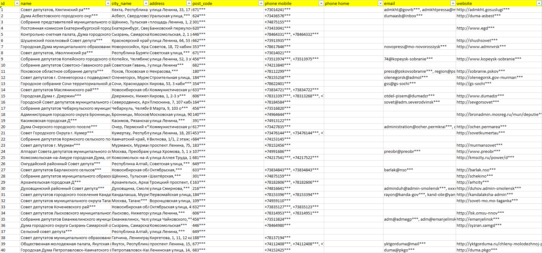 База компаний представительная власть, вся РФ в формате Excel с эл. почтами, телефонами, сайтами, ссылками на соц сети, координатами и другой информацией. Скачайте демо версию, чтобы ознакомиться с данными.