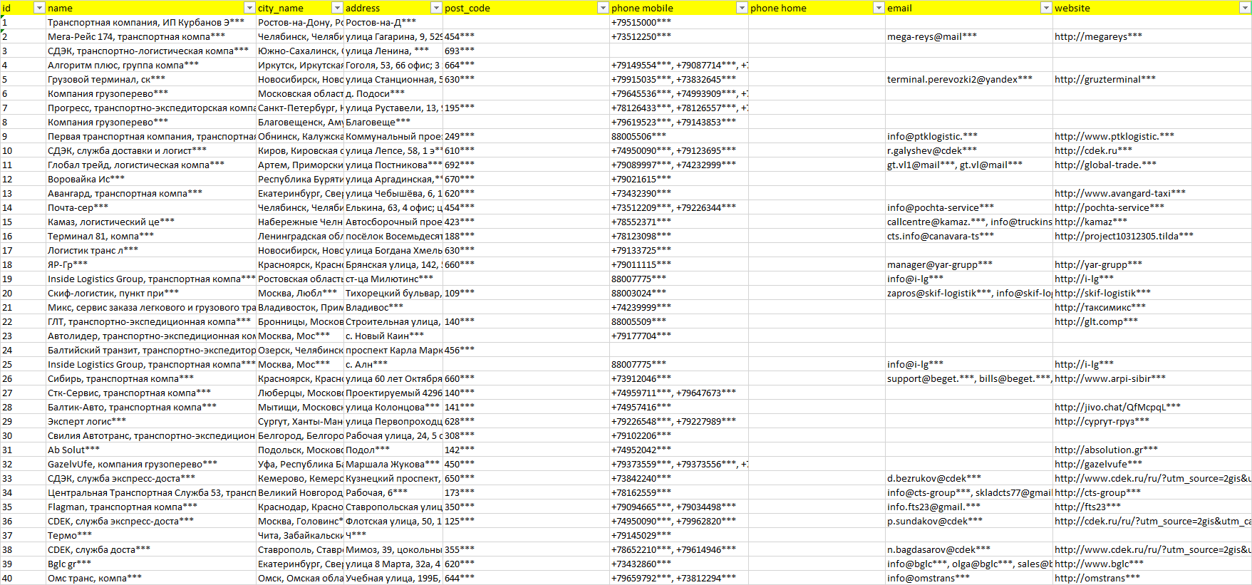 База компаний междугородные автогрузоперевозки, вся РФ в формате Excel с эл. почтами, телефонами, сайтами, ссылками на соц сети, координатами и другой информацией. Скачайте демо версию, чтобы ознакомиться с данными.