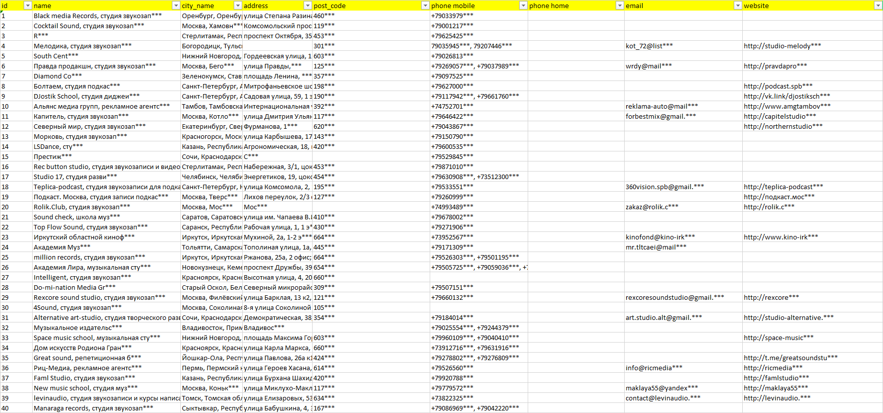 База компаний студии звукозаписи, вся РФ в формате Excel с эл. почтами, телефонами, сайтами, ссылками на соц сети, координатами и другой информацией. Скачайте демо версию, чтобы ознакомиться с данными.