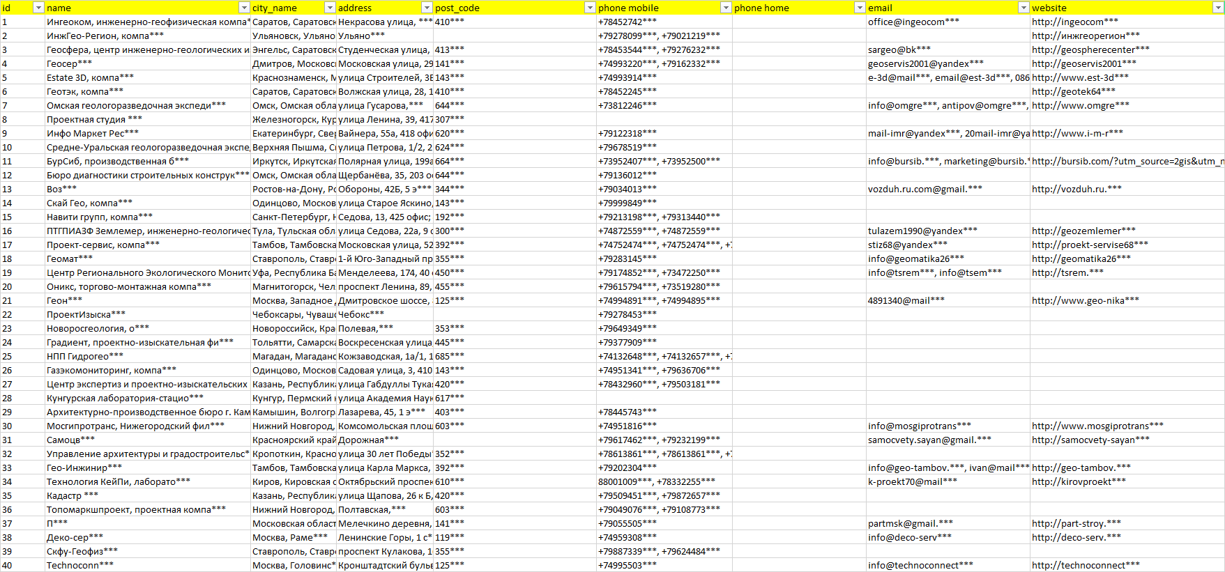 База компаний геологические работы, вся РФ в формате Excel с эл. почтами, телефонами, сайтами, ссылками на соц сети, координатами и другой информацией. Скачайте демо версию, чтобы ознакомиться с данными.